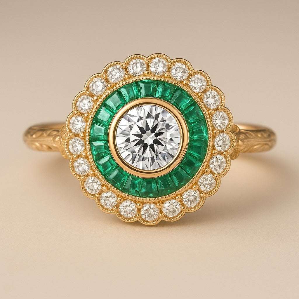 Evoking the charm of a bygone era, the Victorian Meadow ring is a masterful blend of old-world detail and vibrant color. A luminous round-cut diamond rests at the center, bezel-set in rich 18K yellow gold, surrounded by a vivid green halo of baguette-cut emeralds that bloom like fresh spring foliage. Encircled by a scalloped border of glittering diamonds, the ring’s floral motif and intricate milgrain edges whisper of Victorian romance. Delicately engraved along the band, every detail speaks to timeless craftsmanship and nature’s grace — a piece destined to be treasured for generations.